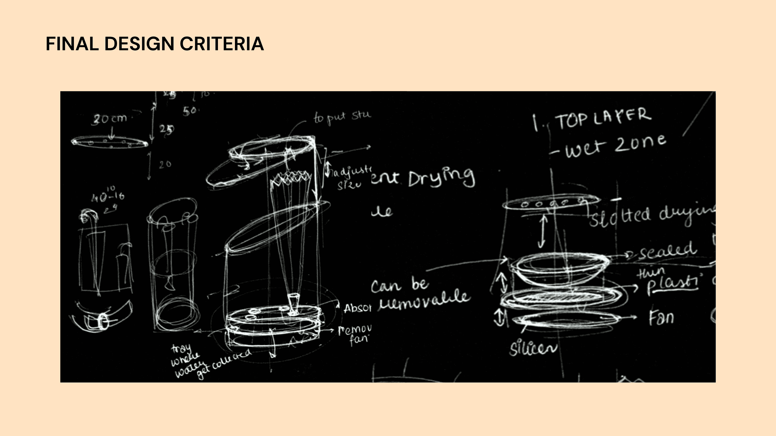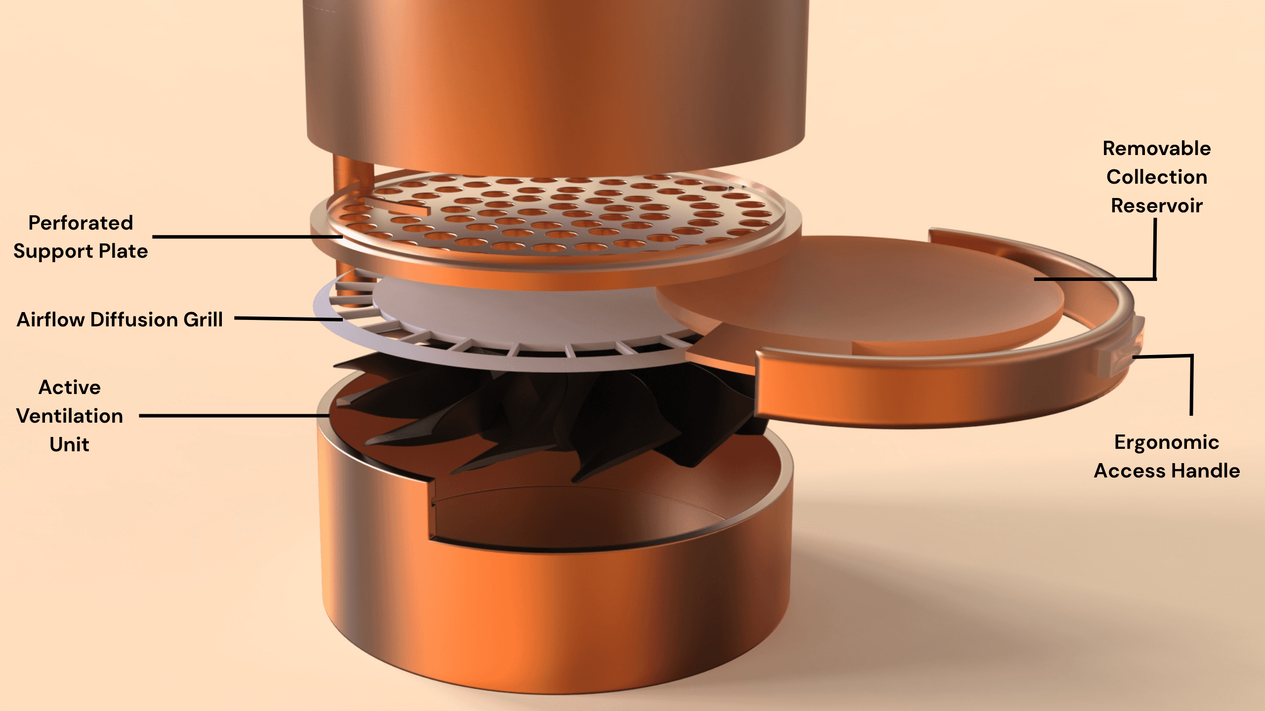 The internal modular assembly optimizes moisture management without compromising structural integrity. A perforated support plate guides water into a removable reservoir, accessed via an ergonomic handle for easy maintenance. Beneath the drainage layer, an active ventilation system—shielded by a protective cover—accelerates the drying process. This compact stack enables a minimalist exterior while housing a sophisticated system for airflow and drainage.