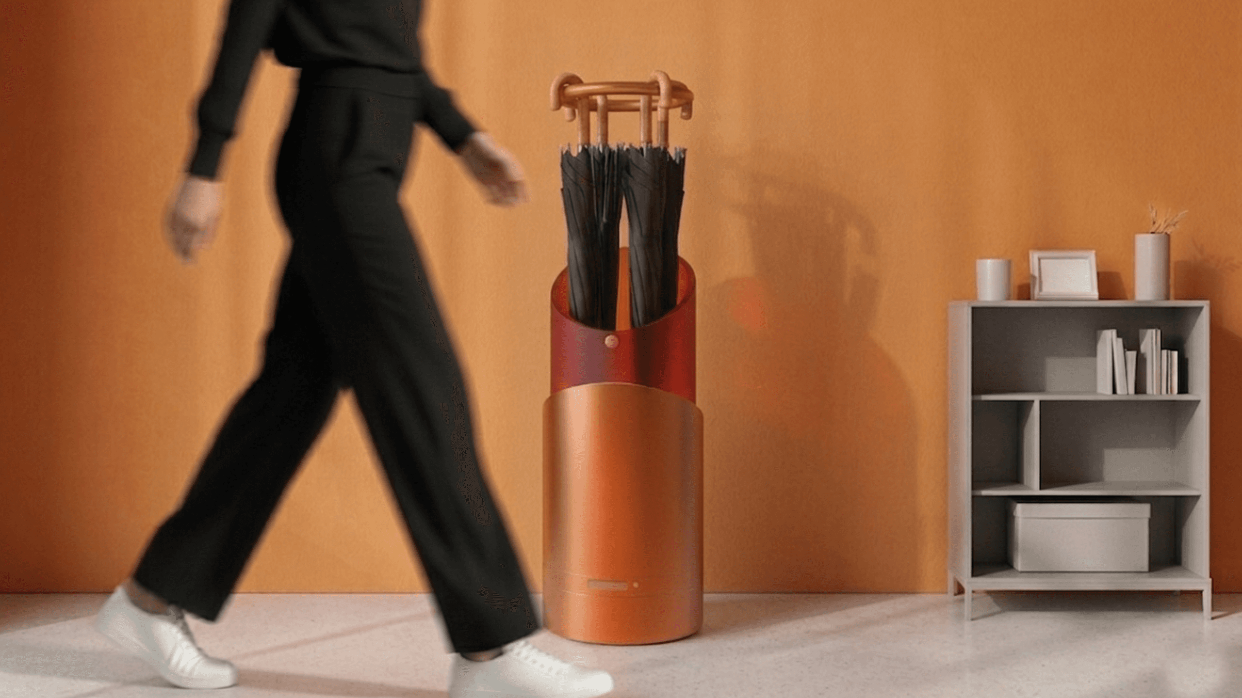 It is a sleek umbrella stand concept that merges functional practicality with a minimalist, human-centered design approach.